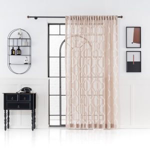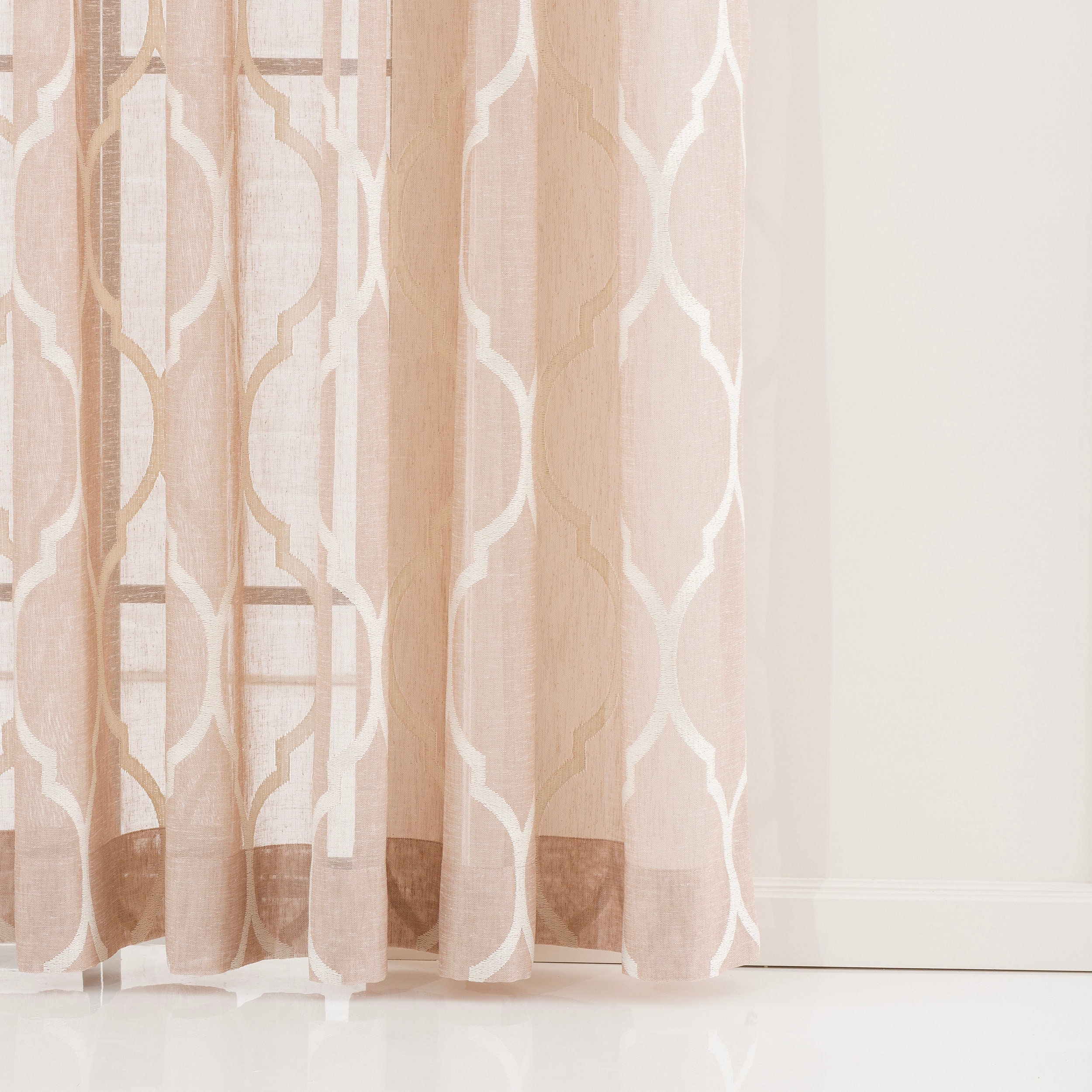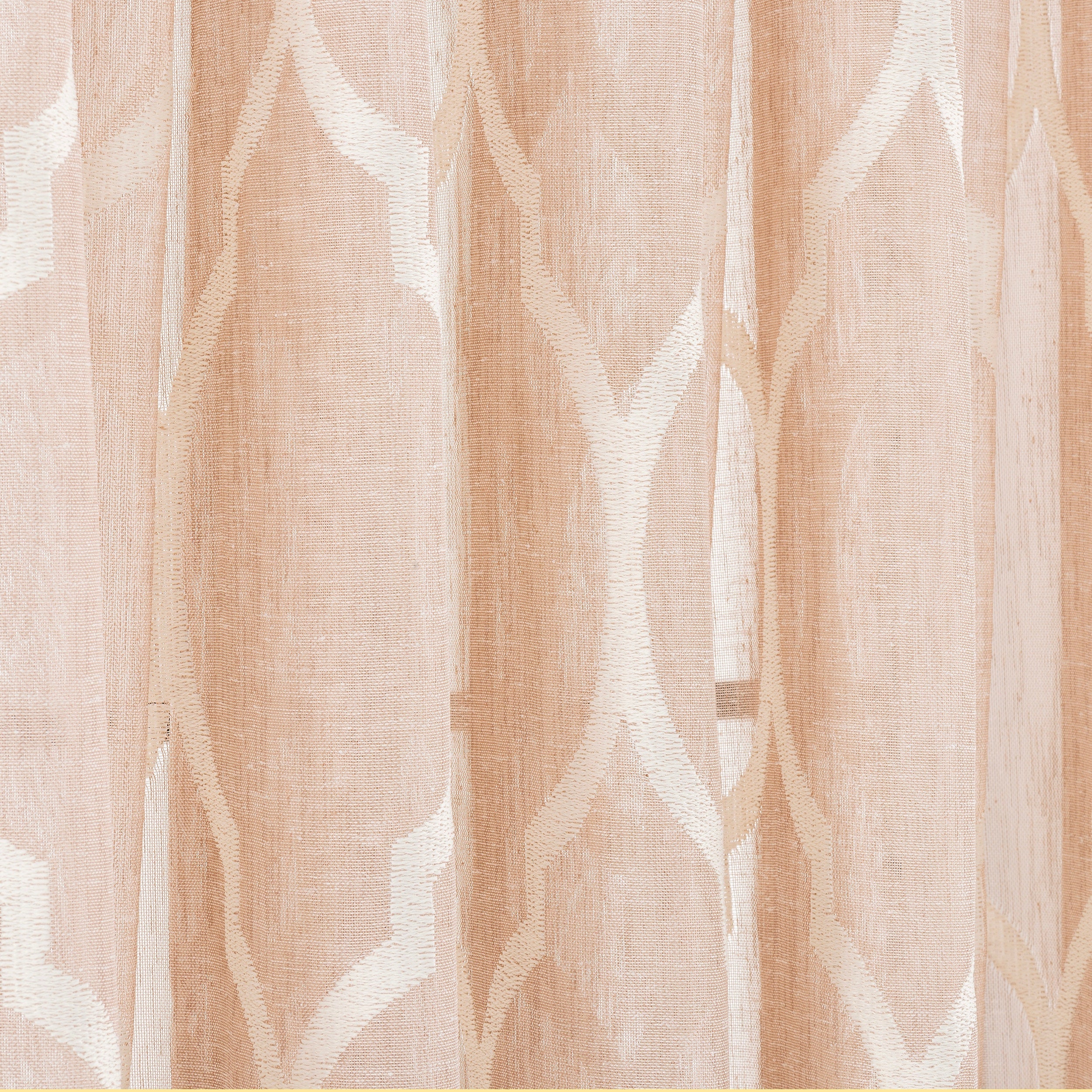 This is a light beige jacquard curtain with a rustic woven texture as the base, dotted with geometric white jacquard patterns, with smooth and rhythmic lines, and the material is light but not draped. When the sun penetrates, it will form a soft light and shadow, making the space full of a warm and relaxing atmosphere.